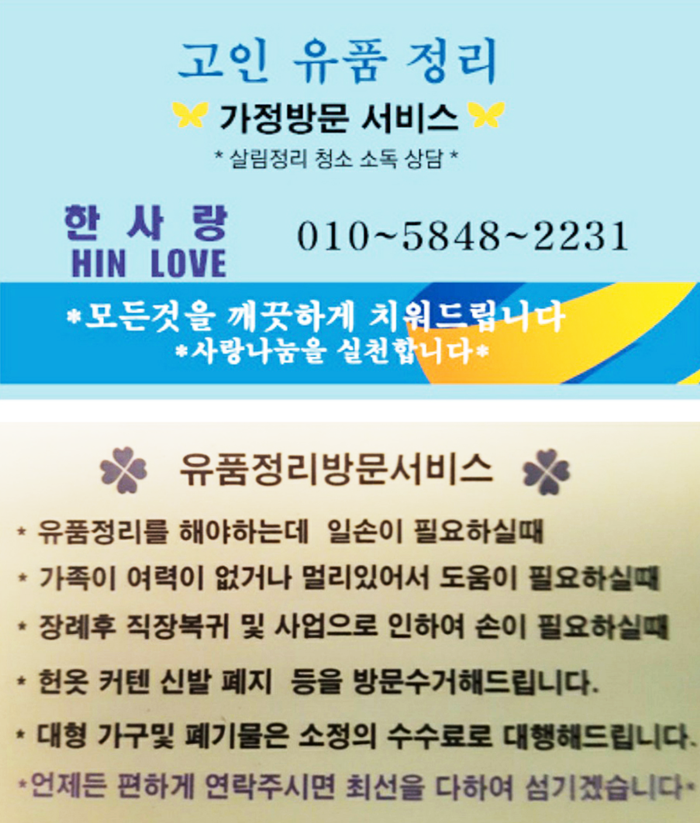 한사랑 홈페이지를 오픈하였습니다. 페이지 정보 작성자.관리자 작성일21-11-26 15:36 조회517회 댓글0건 목록 본문 고인유품정리 및 살림정리 전문업체로 모든 것을 깨끗하게 치워드립니다 댓글목록 등록된 댓글이 없습니다. 목록